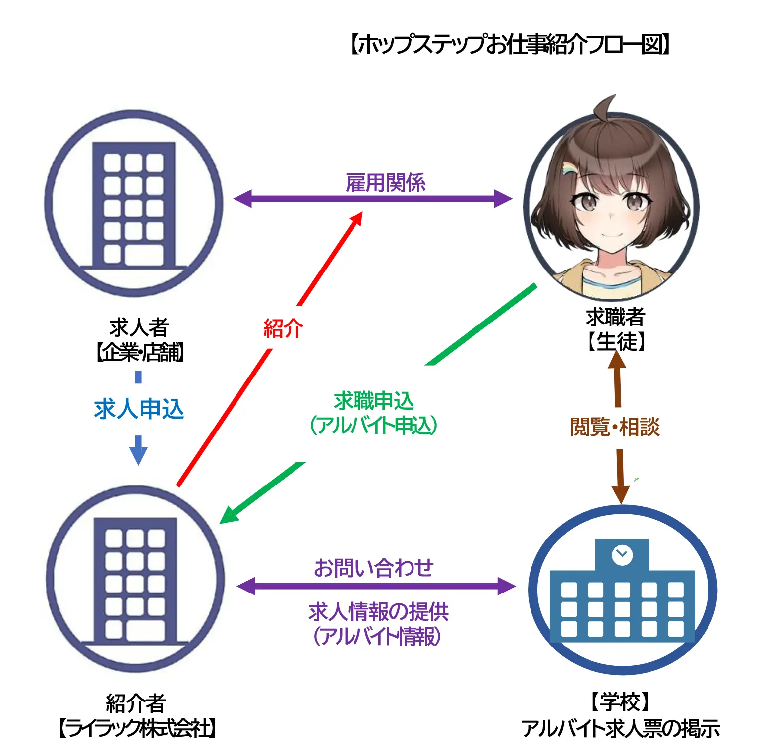 ※ホップステップお仕事体験・お仕事紹介サービスは、弊社の活動にご協力いただいている学校と企業が対象です。