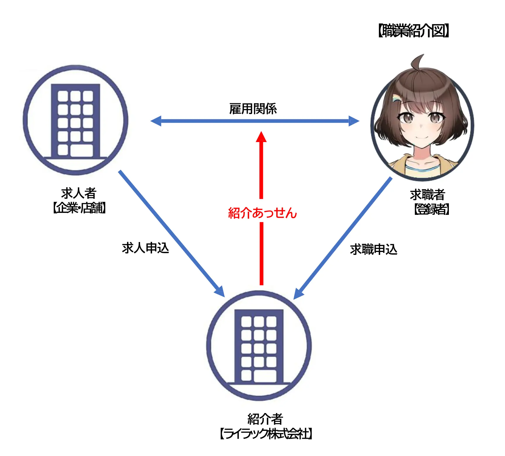 - 求人者と求職者との間をとりもって、雇用関係が円滑に成立するように第三者として世話することをいいます。