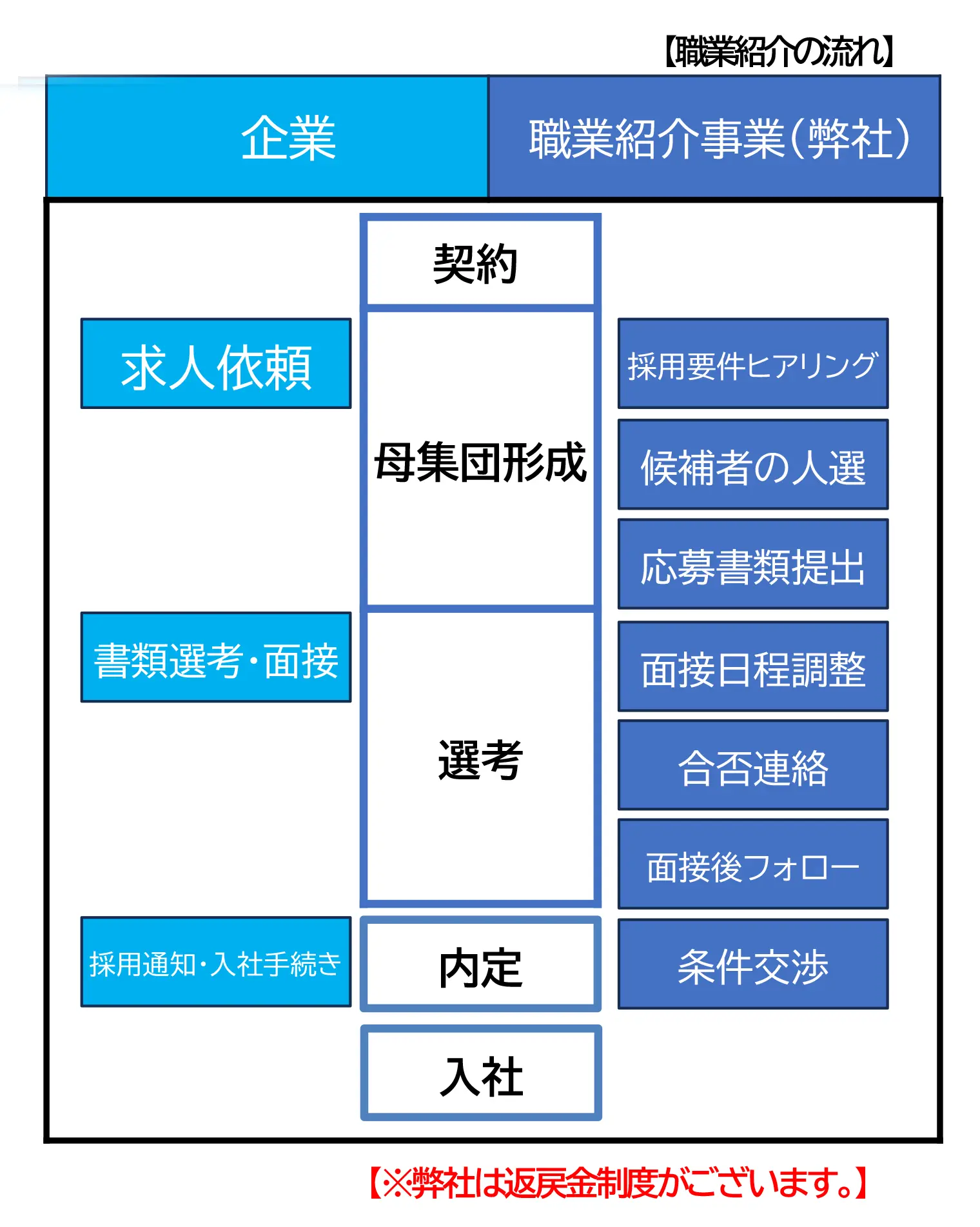 紹介希望の企業様はまず弊社までお問い合わせください。 - 弊社サービスを御利用前に「職業紹介」及び「有料職業紹介事業」に関して以下のご説明をご一読ください。